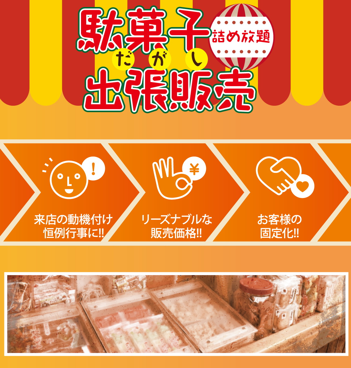 | 商品の特徴 | 駄菓子詰め放題 出張販売!!。先入れ詰め放題。駄菓子詰め放題 出張販売!!。TOKYO GAME SHOW 2025:物販ブース 販売商品のご紹介 VOL.2。先入れ詰め放題リサイクル箱80センチ先入れなし11111円 | ||
